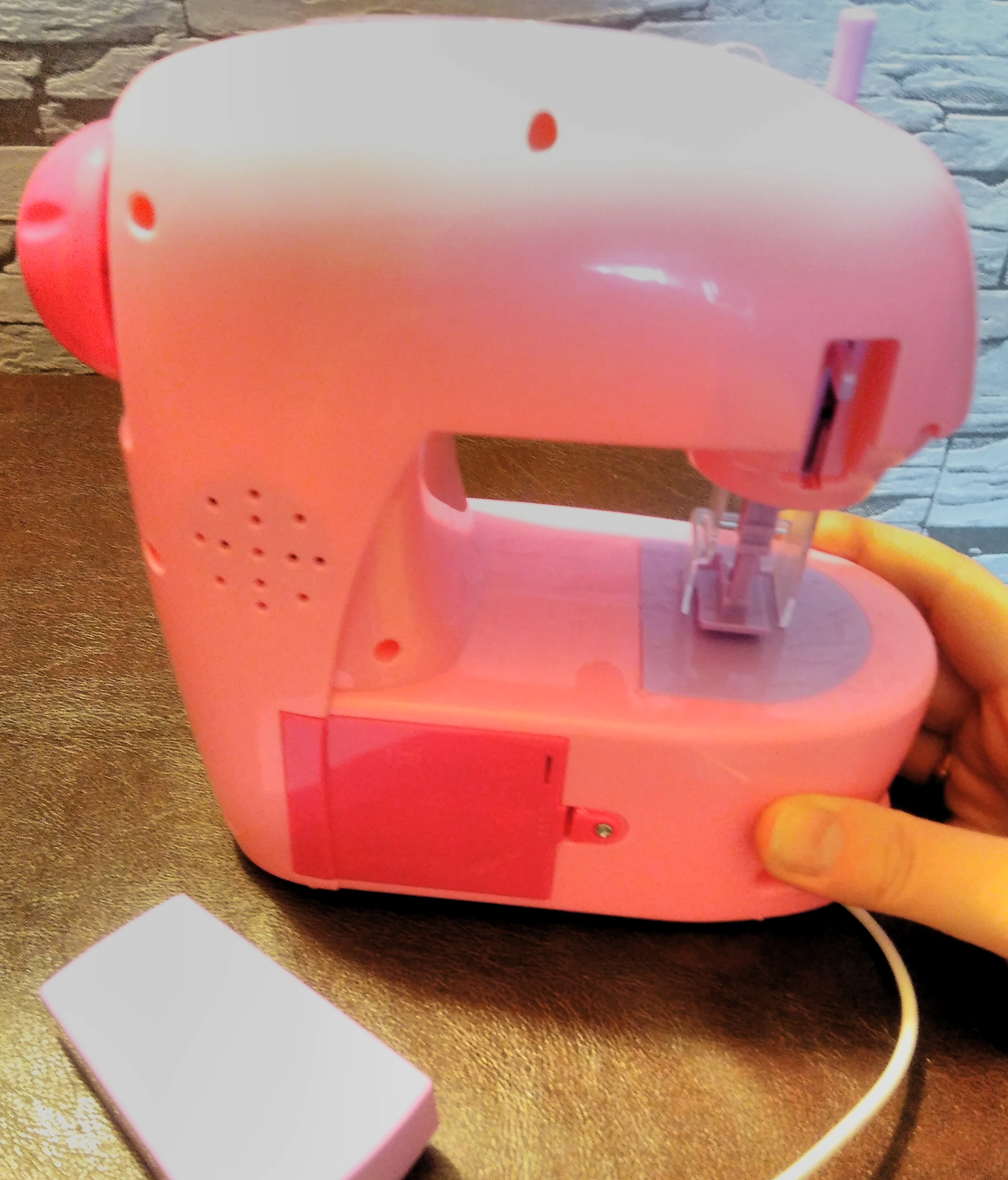 Распаковали не выходя из торгового центра, в кафе, вставили батарейки и дочка нажала на педаль))) Машинка с шумом начала активно шить. Плюс ко всему можно шить вручную и есть кнопка для включения музыки. Что еще немаловажно — это безопасность. Я боялась что маленькие пальчики могут случайно попасть под иголку, но тут все предусмотрено: швейная игла закрыта прозрачным пластиковым ограничителем.