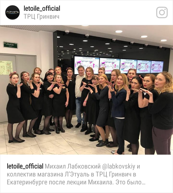 Когда Михаил закончил мероприятие, я увидела, что сотрудники магазина Л’Этуаль собираются вместе для фото с ним. Это был единственный шанс сфотографироваться с человеком, который изменил мою жизнь. Коллектив магазина очень приятным оказался, они разрешили мне встать в их общую команду. Спасибо им огромное за это. Девушки все позитивные и добрые.